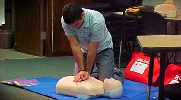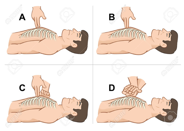 Al confirmarse la posibilidad de paro cardiaco, se debe proporcionar ayuda, colocándose del lado derecho o el izquierdo de la persona, localizando el borde costal, recorriéndolo con los dedos hasta llegar a la punta del esternón (apéndice xifoides) de ahí 4 centímetros por arriba para quedar colocado en unión de tercio medio con tercio inferior del esternón y proceder con los brazos estirados desde los hombros sin flexionarlos, con una de las manos apoyando la mitad inferior sobre la zona descrita, la otra entrelazada por arriba, para después continuar presionando y balanceando todo el cuerpo en cada compresión como un pistón que tiene como intensión exprimir el corazón y darle la oportunidad de llenarse al retroceder, para volver a exprimirlo y así sucesivamente permitiendo el paso de sangre hacia el cerebro principalmente y resto del organismo.