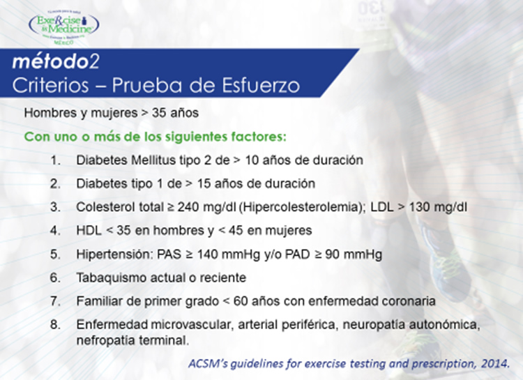 En esta lista describimos al grupo de pacientes que médicamente consideramos candidatos a prueba de esfuerzo antes de iniciar o progresar en su plan de actividad física, ejercicio o deporte.